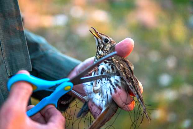 Singdrossel wird vorsichtig aus illegalem Fangnetz herausgeschnitten © SPA