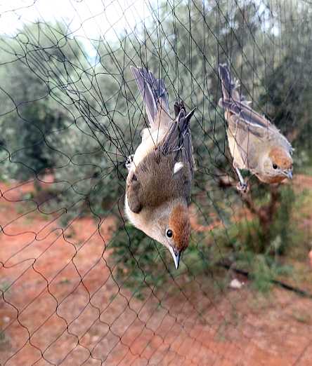 Zwei Mönchsgrasmücken-Weibchen gefangen in illegalem Fangnetz © Komitee gegen den Vogelmord