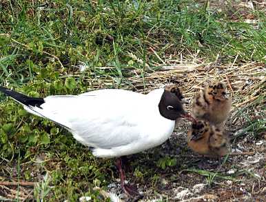 Lachmöwe mit Küken in der Feuchtwiese © SPA