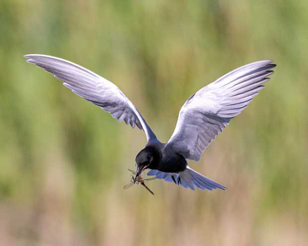 Trauerseeschwalbe mit Libellen-Beute © H. Glader