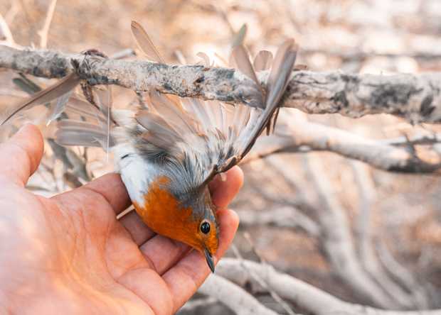In Baumschlingenfalle stranguliertes Rotkehlchen © SPA