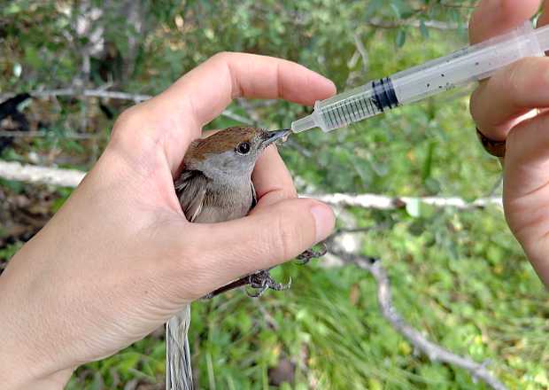 Mönchsgrasmücken-Weibchen bekommt nach Befreiung von Leimrute Wasser © Komitee gegen den Vogelmord