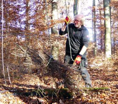Auf Anweisung aus luftiger Höhe werden in der näheren Umgebung kiloweise trockene Äste, Moos und frische Fichtenzweige gesammelt und auf Maß zugeschnitten. Per Seil wird das Nistbaumaterial in die Höhe gezogen.