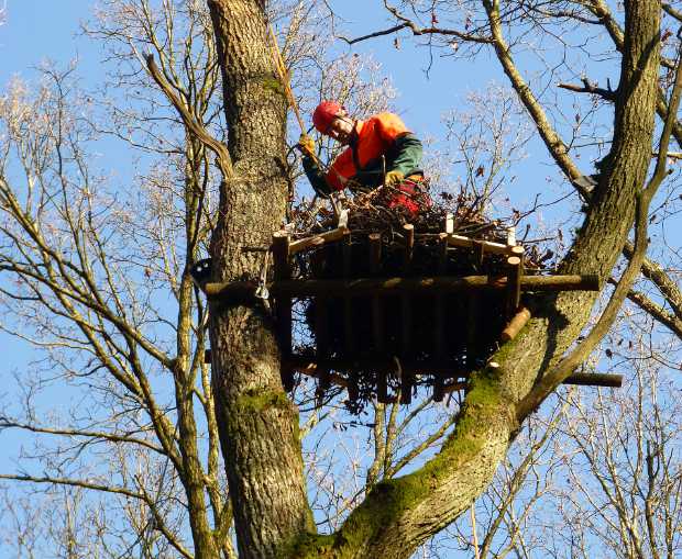 Der Aufbau eines Schwarzstorch-Kunsthorstes in einem dafür geeigneten alten Baum in bis zu 25 m Höhe dauert bis zu 6 Stunden und erfordert neben Schwindelfreiheit eine Baumkletterausbildung und beste körperliche Verfassung, um im Seil hängend oder auf Ästen stehend die stundenlange harte körperliche Arbeit durchzuhalten.