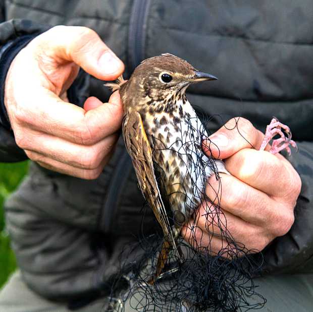 A Song Thrush is carefully cut out of an illegal mist © SPA